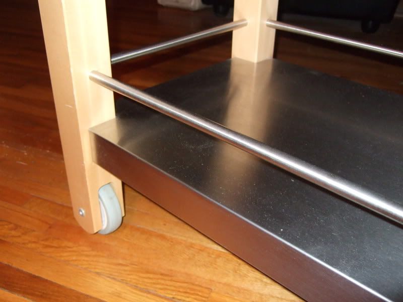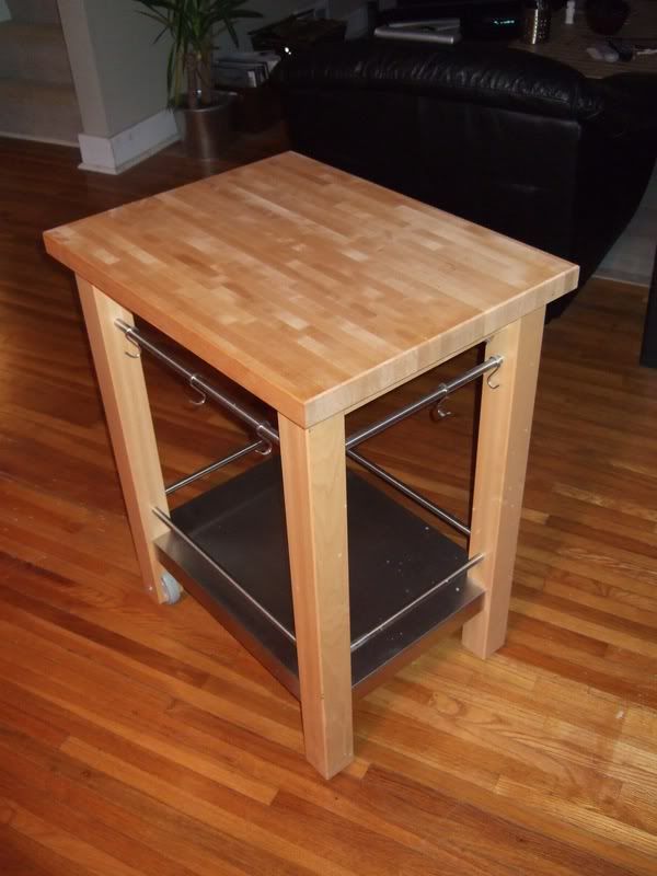Kitchen cart is wood construction with stainless accents. Feet on two legs roll with ease. Butcher block top is soild and in great shape. $125