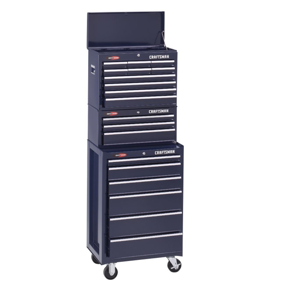 “Chest, intermediate chest, and roll-away with midnight blue baked enamel shell and full-extension drawers with friction slides. All pieces feature an internal locking system with two reversible over-molded keys and full-width aluminum drawer pulls. Roll-away features four 4-1/2 in. x 1-1/2 in. casters and exclusive I-Frame® construction. Chest measures: 26 in. W x 12 in. D x 19-3/4 in. H Intermediate chest measures: 26 1/2 in. x 12 in. x 12 1/4 in. Roll-away measures: 26-1/2 in. W x 18 in. D x 40-3/4 in. H with casters.”