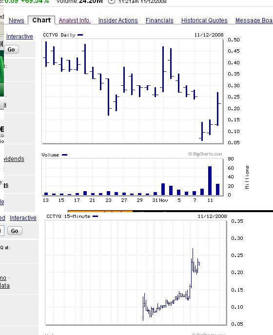 Hmm, scottrade has cctyq listed at $1.02, yahoo finance has it at $0.10. Hmm…