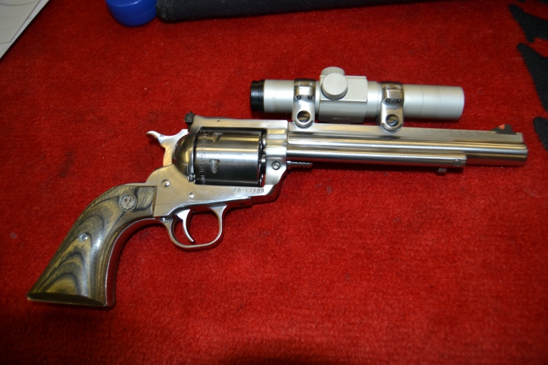 Ruger Super Blackhawk. 7.5" barrel, stainless. Bought on armslist.com, brand new in original box, never fired. It’s going to get an Ultra Dot sight and Hogue grips. Will end up somthing like this.